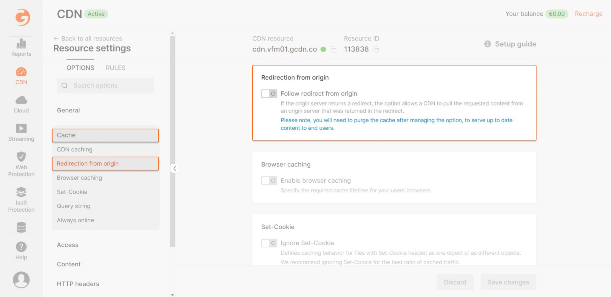 2. In the sidebar, under the Cache section, select Redirection from origin.