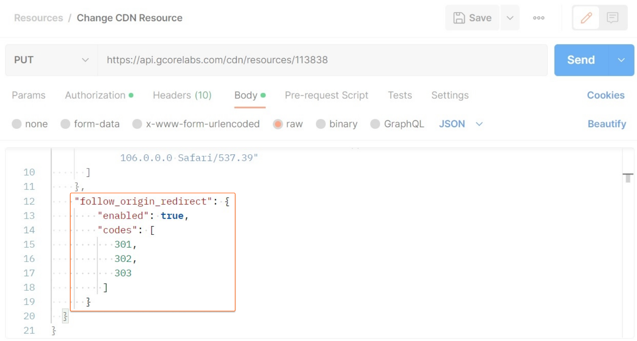 This example shows a CDN update request that activates the Redirection from Origin and instructs the CDN to follow redirects for status codes 301, 302, and 303.