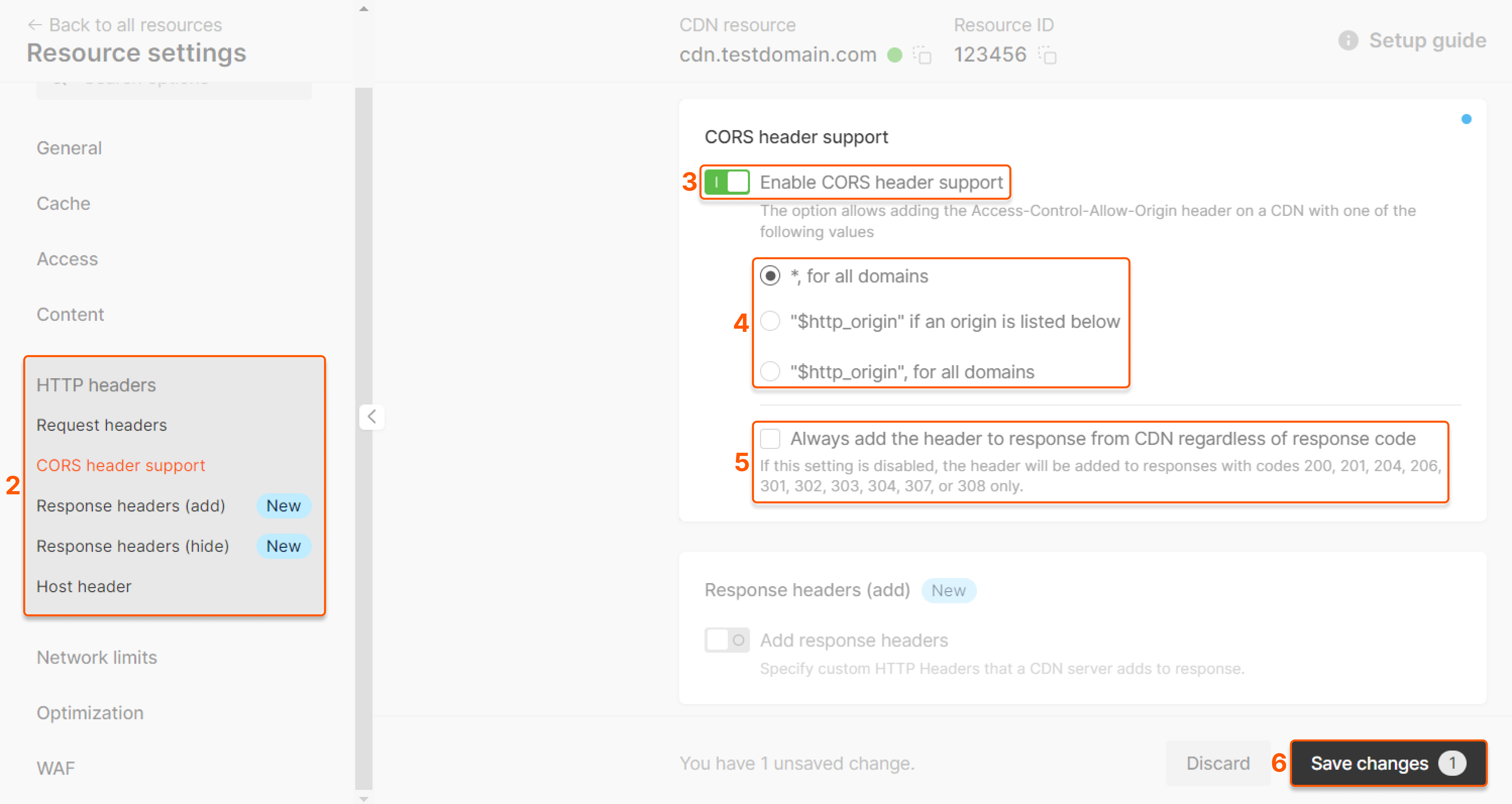 1. Go to the CDN section in the CDB Technical Web Portal and click the custom domain of the resource for which you want to configure CORS to open the resource settings.