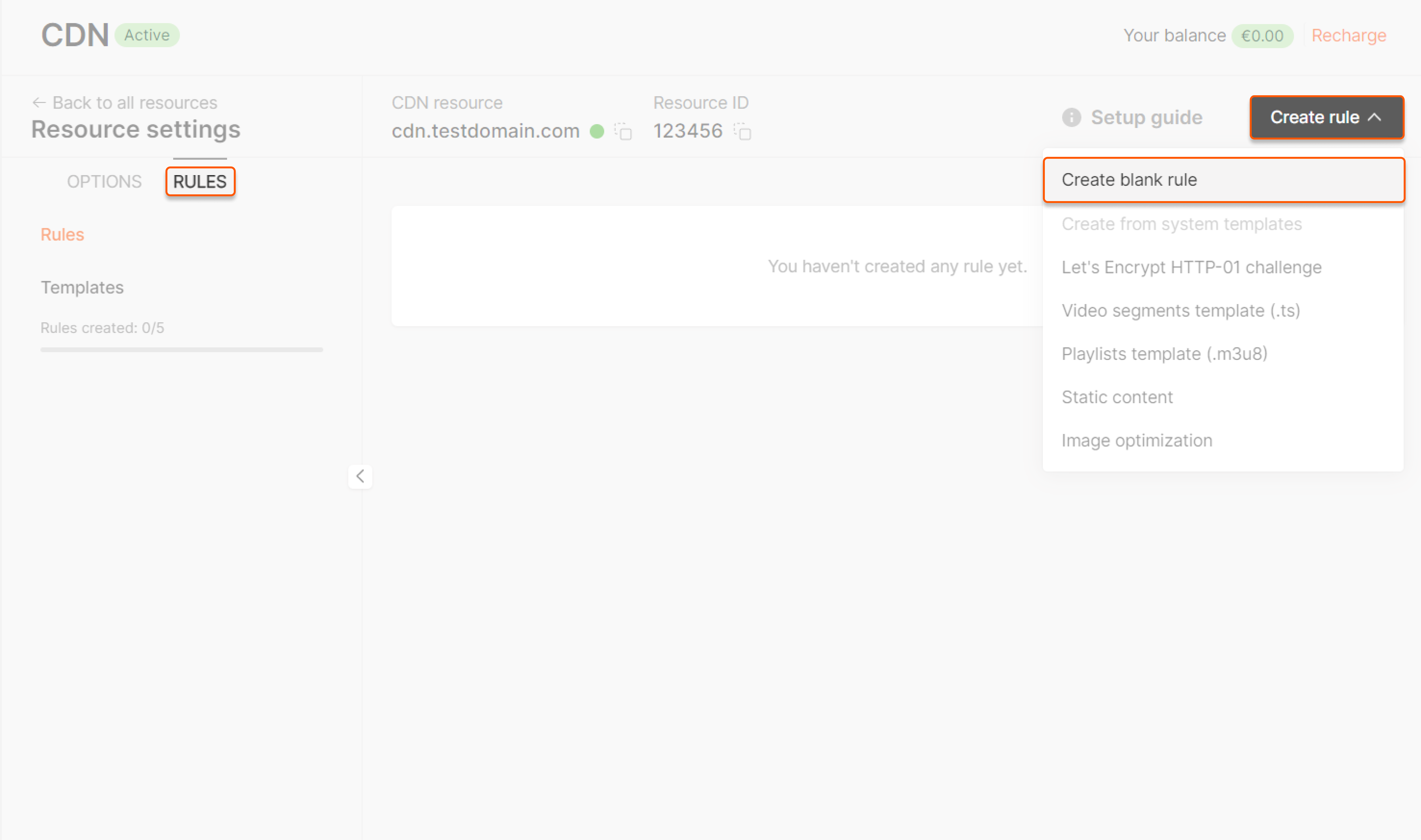 2. Open the "Rules" section, click Create rule and select Create blank rule from the list.