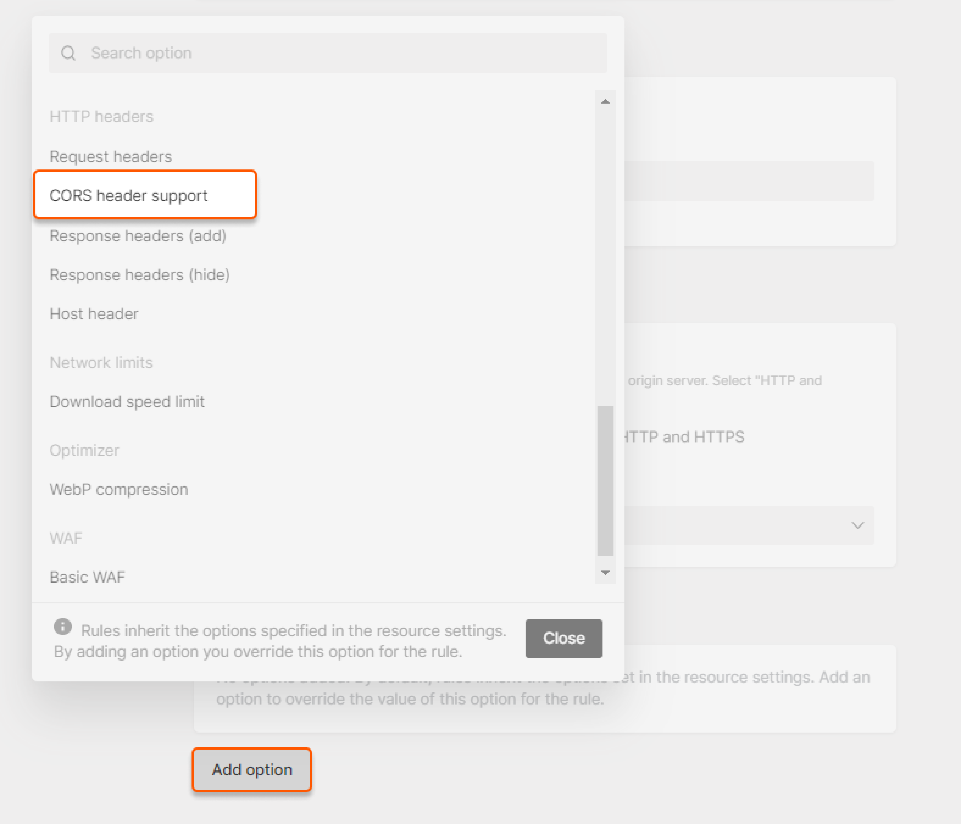 There are three methods to configure CORS header supports: in the resource settings, over the rule creation, and on the origin server.