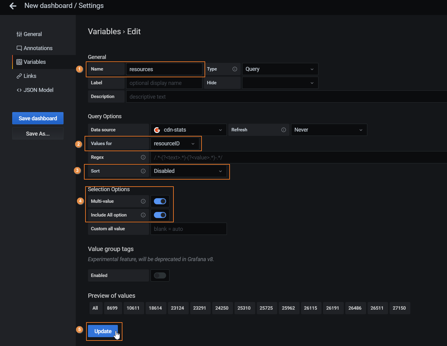 - In the Values for you can select a value for the variable: resourceID (resources).