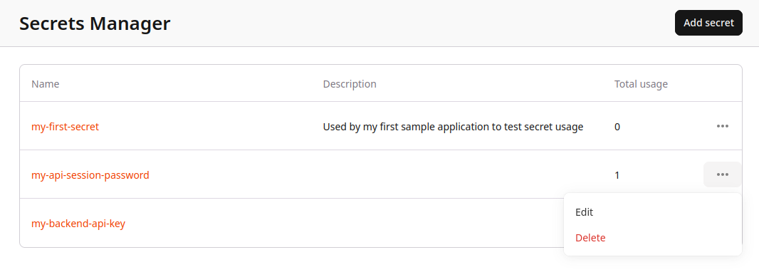 2. Find the secret you want to delete. click the three-dot icon next to the secret and select delete.