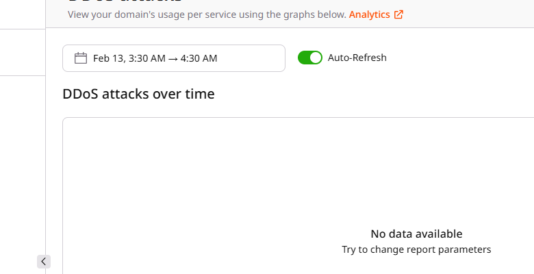 We provide detailed analytics related to any DDoS attacks that were detected in your domain. DDoS analytics is stored for 32 days.