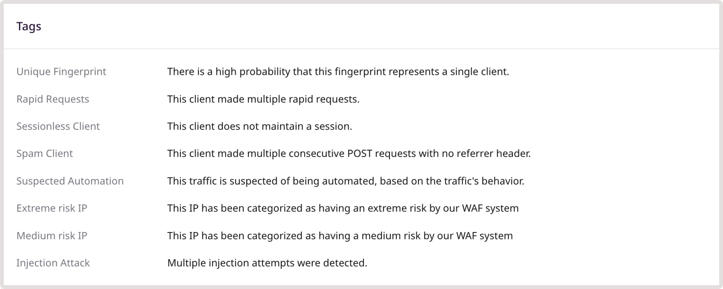 - Tags: Lists any tags associated with the request, helping you quickly identify malicious activities related to that request.
