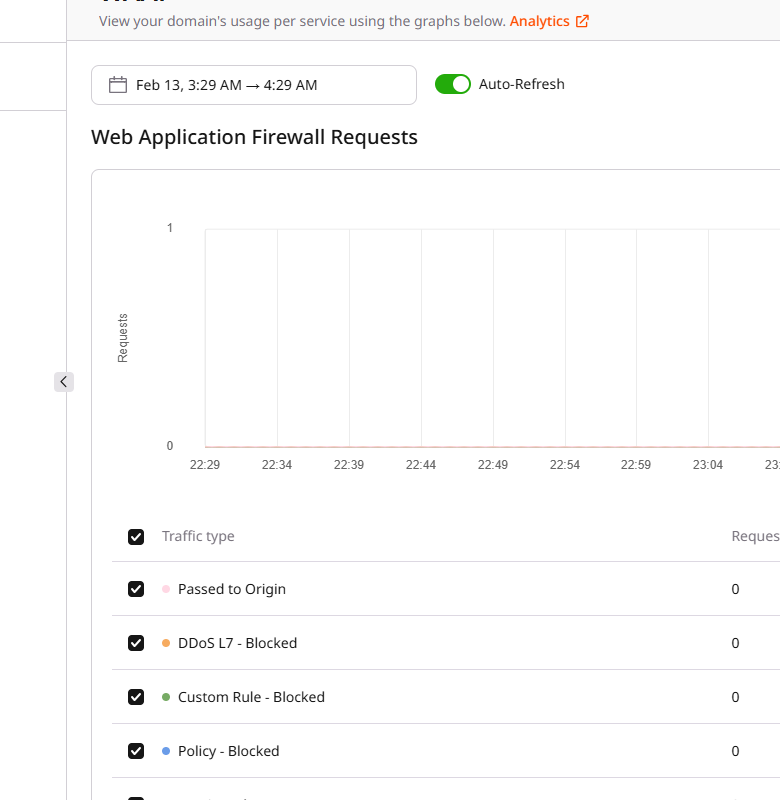 This page features detailed statistics on HTTP requests and displays data in the graph format (Web Application Firewall Requests) and as a table (Requests).