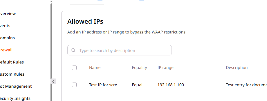 Allowed IPs: Permit specific IPs or IP ranges to access your domain without any restrictions or security checks.