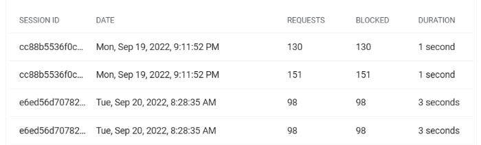 You can check the session ID, the date the session took place, the time-to-live (TTL) of the request, if it was blocked, and the session duration.